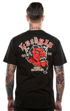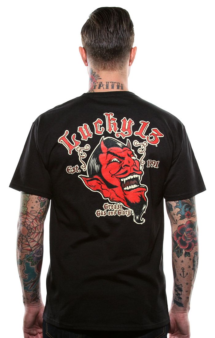 The "Grease Gas & Glory" short sleeve tee is a soft spun heavyweight 6.1 ounce 100% cotton short sleeve tee, with 1x1 rib knit collar, shoulder to shoulder taping, cover-seamed neck and double needle sleeves. This classic design features a full back print of our "Grease, Gas & Glory" Devil Head design and a front left chest to match.