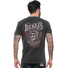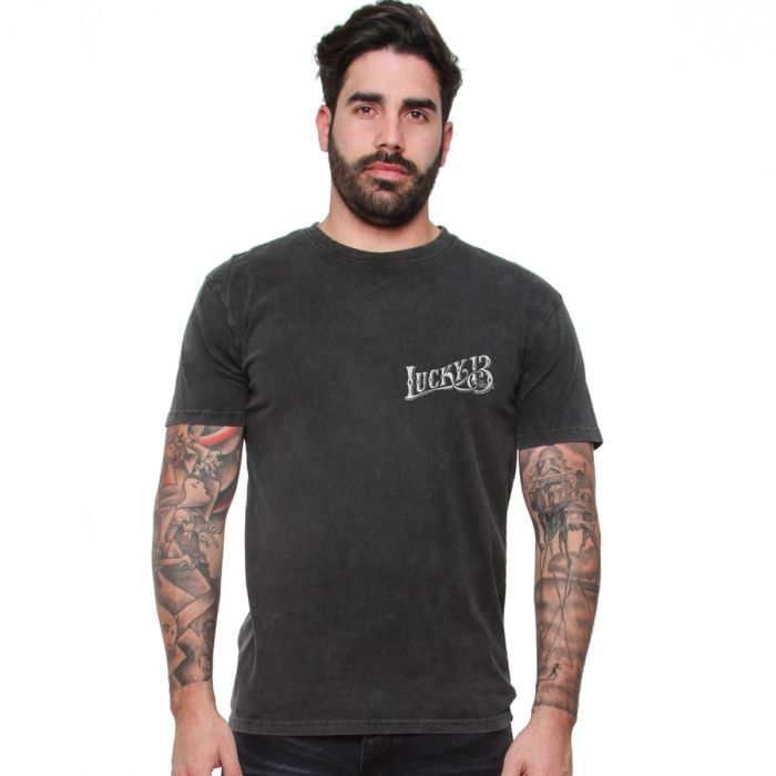 The "SKULL BUILT" short sleeve men's tee is a 100% cotton Vintage Washed Brow Tee. There is a full back print of the "a big Vintage Skull" , and a "Lucky Thirteen" front left chest print as well.