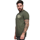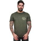 The "VINTAGE IRON" short sleeve men's tee is a 100% cotton Vintage Washed greenTee. There is a full back print with "a big Vintage Bike" , and a "Lucky Thirteen" front left chest print as well.