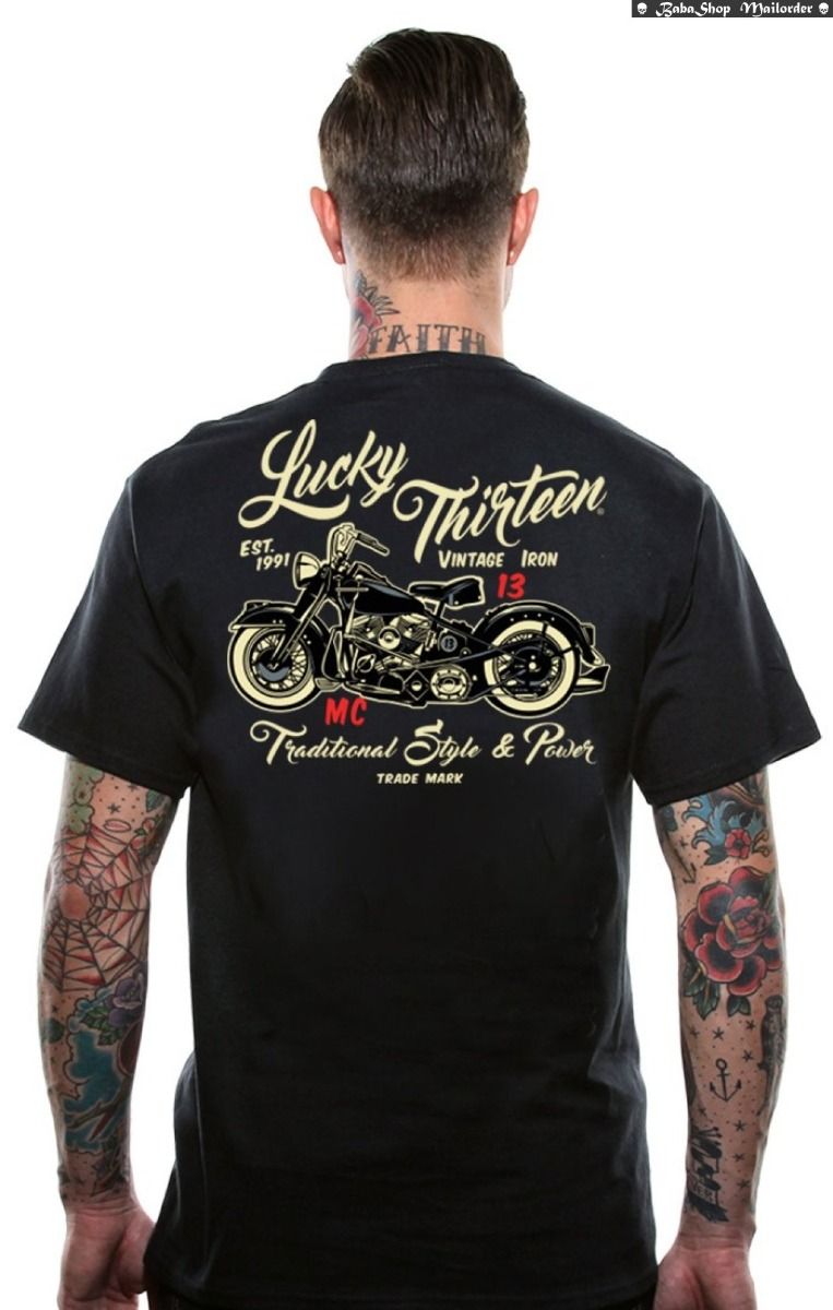 The "VINTAGE IRON" short sleeve men's tee is made with a 6.1 ounce 100% soft-spun cotton tee with a 1x1 rib knit collar, shoulder to shoulder taping, cover-seamed neck and double needle sleeves. There is a full back print of the "Motor Bike", and a "Lucky Thirteen" front left chest print as well.